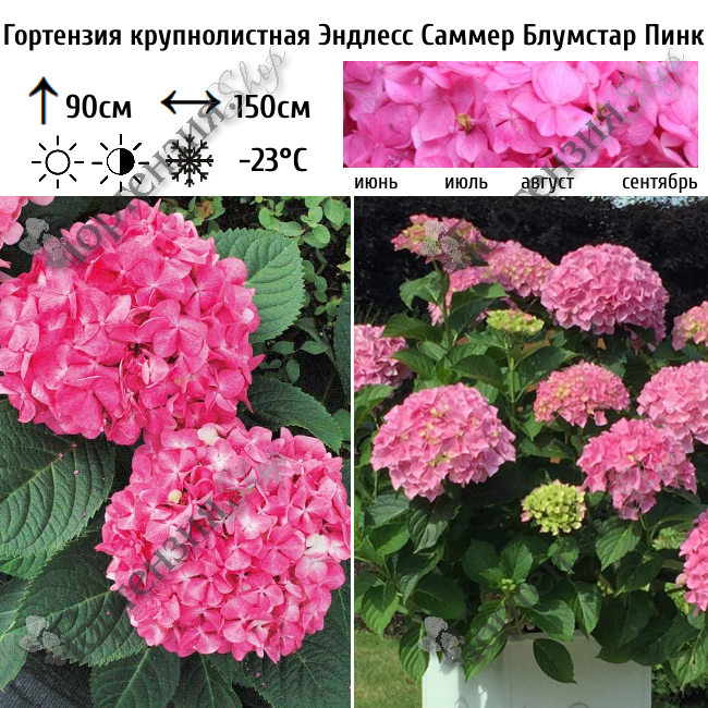 За способность цвести повторно сорт назвали Endless Summer Bloom Star. Endless Summer Bloom Star – гортензия крупнолистная, которая способна образовывать цветки на новых побегах этого года так же хорошо, как и на побегах прошлого года, и обладающая высокой зимостойкостью. Если и пострадают почки на прошлогодней древесине, то все равно зацветут молодые побеги. Гортензия Endless Summer Bloom Star цветет красивыми, крупными шарообразными соцветиями диаметром 15-18 см, состоящими из стерильных цветов розового или синего цвета - в зависимости от кислотности почвы, в которой она растет. В щелочной почве она окрашена в розовый цвет, а в кислой с большим содержанием алюминия – в голубой. Побеги бордовые, прочные. Взрослый куст гортензии может достичь 1 м в высоту. Для посадки подходит место с утренним солнцем и тенью в полдень с влажной и хорошо дренированной почвой. Подходит для выращивания в качестве отдельного растения, в группах, для большого контейнера или в смешанных посадках.