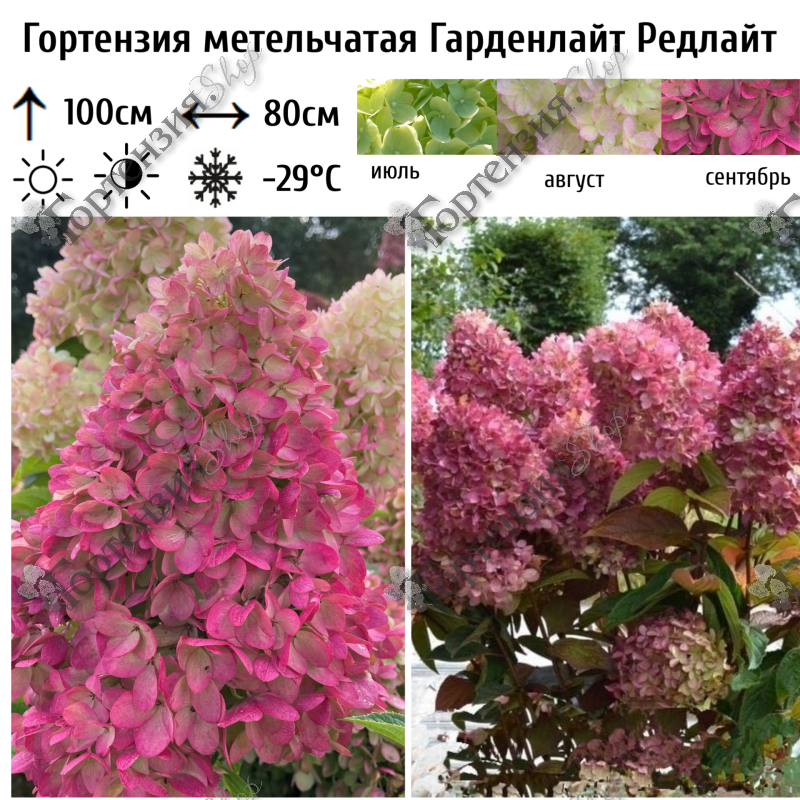 Гортензия метельчатая Редлайт (Redlight) пышно цветущий очень компактный кустарник. Высота куста до 100 см, ширина до 80 см. Ветви крепкие прямостоящие. Листья зеленые , цветет с июля по сентябрь. Цветы в начале лаймового цвета, далее окрашивается в светло-розовый, а затем постепенно становится темно-красным. Почва должна быть кислая, влажная, но без застоя воды. Зимостойкость-29С. Используется для миксбордеров, небольших садов можно выращивать в контейнере.