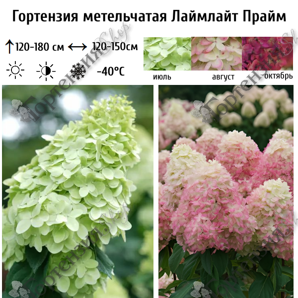 Гортензия метельчатая Лаймлайт Прайм (Hydrangea paniculata Limelight Prime) - улучшенный сорт гортензии Лаймлайт. Куст густой с плотно набитыми конусовидными соцветиями, 25 см. Стебли прочные и крепкие, куст не разваливается, цвет листьев более темный. Зацветает чуть раньше, в июле лаймовым, постепенно переходя в розовый цвет, к осени становится насыщенно-розовым, почти красным, цветение продолжается до сентября. Размер куста около 120-180 см в высоту и 120-150 см в ширину. Этот сорт подходит для живых изгородей, для выращивания в садах, как в открытом грунте, так и в кашпо. Морозостойкость до -40°C. Подходит для более северных регионов. Один из сортов, который подойдет для срезки.