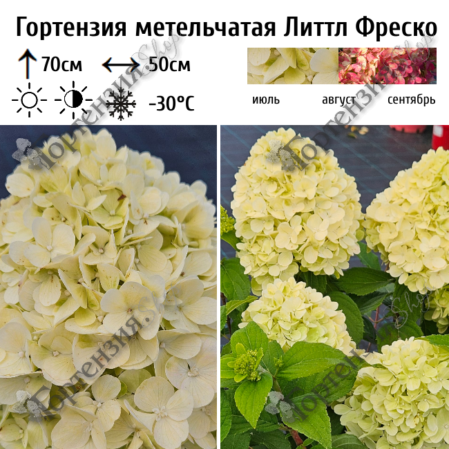 Замечательный компактный сорт Литтл Фреско (Littl Fresco) высотой около 70 см, в ширину разрастается до 50 см, имеет жесткие вертикальные побеги, которые хорошо держатся после сильного дождя и ветра. Огромные метелки состоят из стерильных кремово-белых и светло-зеленых цветков, которые постепенно приобретают нежно-розовые оттенки. Цветет с июля по сентябрь. Предпочитает открытые солнечные участки или легкую полутень. Растение неприхотливое, устойчивое к болезням и вредителям. Почвы увлажненные, кислые, богатые гумусом, дренированные. Морозостойкость до –30ºC.Отлично будет смотреться в кашпо на балконах или террасе, роскошная бордюрная изгородь.