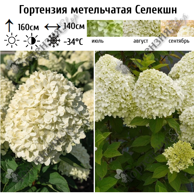 Гортензия метельчатая (Hydrangea paniculata) Селекшн (Selection) - компактный куст высотой до 160 см. Побеги сильные, прочные. Стебли окрашены в красно-коричневый цвет, крупные листья — зелёные. Соцветия формируются в виде плотных ширококонических метёлок. Соцветия белые с переходом в нежно-розовый оттенок. Цветение с июля по сентябрь.