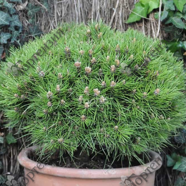 Сосна черная 'Мари Брегон' Pinus nigra 'Marie Brégeon'' - хвойное дерево, правильной шаровидной формы. высотой до 80 см, Низкий прирост от 5 до 9 см в год, Иголки длиной около 10 см, светло-зеленые, во взрослом возрасте заметно закрученные в спираль, живут 3–4 года. Зимой они могут слегка и естественно желтеть, ее форма и замедленный рост позволяют использовать эту сосну в горшках на террасах и балконах, а также в небольших современных садах.