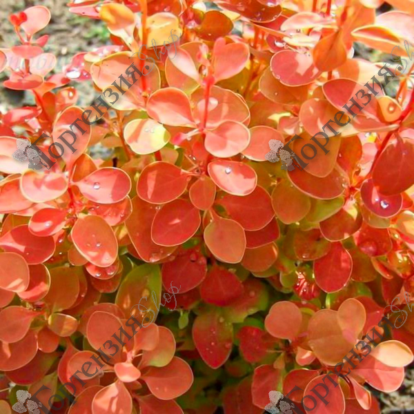 Барбарис Тунберга 'Оранж Айс 'Berberis thunbergii 'Orange Ice' - листопадный декоративный кустарник с колоновидной кроной и необычной окраской листьев, высотой до 70 см. Листья весной и летом оранжево-медные, осенью красные и ярко-оранжевые. Цветки мелкие, жёлтые. Цветение в мае. Плоды мелкие, красные, созревают в сентябре. Место солнечное, к почве нетребователен.