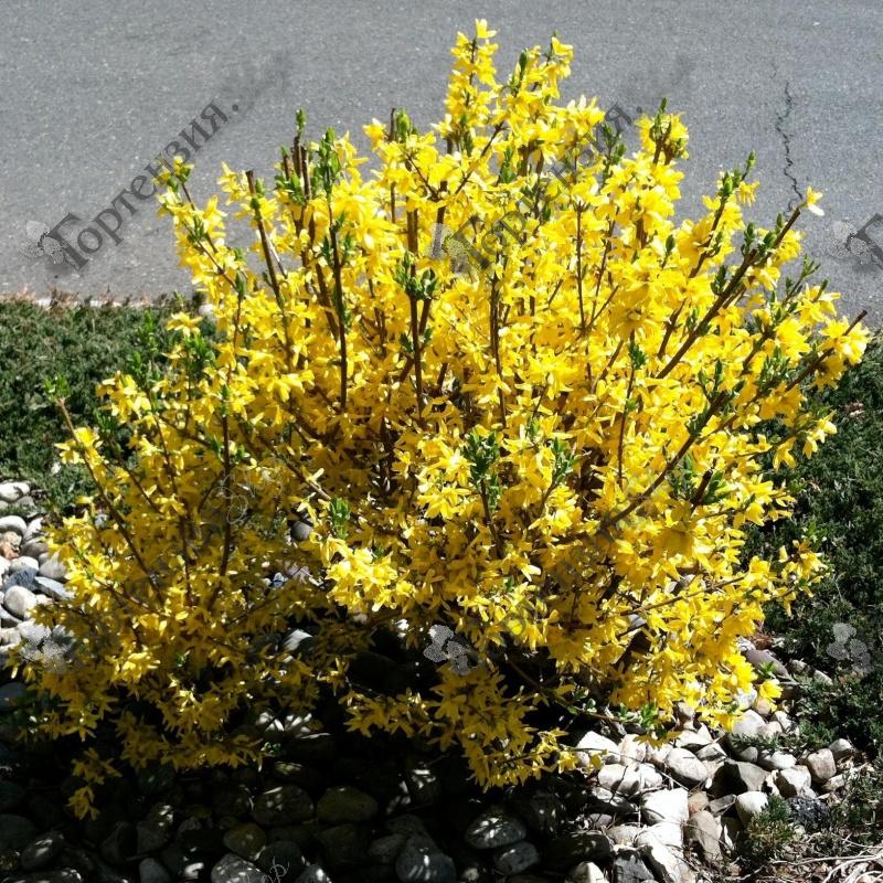 Форзиция промежуточная Миниголд (Forsythia intermedia Minigold) – декоративный кустарник, который украшает сад самым первым после схода снега. Высота форзиции этого сорта – до 0,8 м., в ширину достигает 1 м. Ярко-желтые сочные цветки диаметром 2,5-3,5 см, появляются в большом количестве, равномерно распределены на побеге. Цветет в апреле-мае.