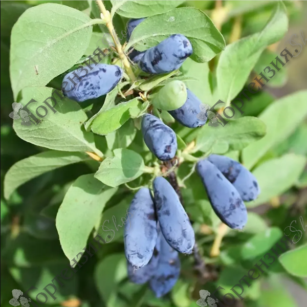 Плоды цилиндрической формы темно-синего или фиолетового цвета. Размер ягоды 1,5-2,2 см в длину, вес до 1,8-2 г. Кожура тонкая, с матовым налетом. Мякоть плотной структуры, имеет кисло-сладкий вкус без горечи. Урожайность сорта «Васюганская» до 3-4 кг с одного взрослого куста. После созревания ягоды осыпаются.