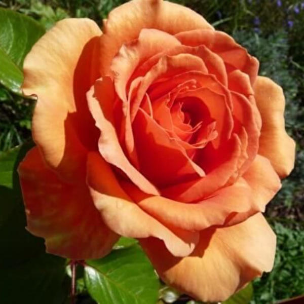 Роза чайно-гибридная 'Ashram/ Bora Bora' - цветки диаметром 10-15 см, сенсационного оранжевого тона, сверкают как пламя, устойчивы к дождю, хорошо стоят в срезке. Они появляются в зонтиках, в каждом по 3-5 цветков. Кусты крепкие, высотой до 100 см. листья невосприимчивы к мучнистой росе, устойчивы к черной пятнистости.