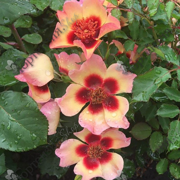 Роза миниатюрная Fancy Babylon Eyes  - это удивительное сочетание ярких персиковых лепестков с темно-красным базальным пятном в основании лепестков, создающее гармоничный контраст цветов. В процессе цветения, оттенки цветков меняются, добавляя изысканный акцент в саду. Цветки простые, около 6 см, обладают легким ароматом, что придает им особый шарм. Цветение обильное, повторное в течение сезона. Листва устойчивая к заболеваниям. Куст компактный, высотой 50-70 см. Рекомендуется как бордюрная, контейнерная или балконная роза.