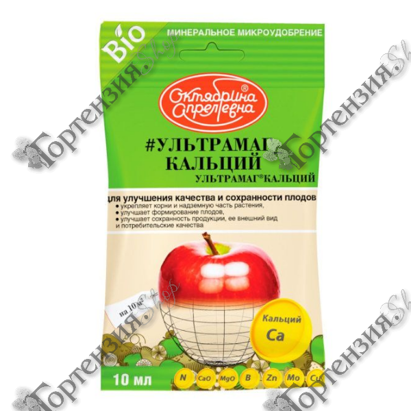 Удобрение биостимулятор "Ультрамаг Кальций",  с высоким содержанием кальция в легкоусвояемой растением форме. Предназначен для улучшения качества и сохранности плодов, укрепляет стебель, повышает прочность тканей растения, предотвращает пожелтение листьев. Подходит для плодовых, плодово-ягодных, косточковых, овощных, бахчевых, цветочно-декоративных культур, картофеля, земляники, винограда, и др.,